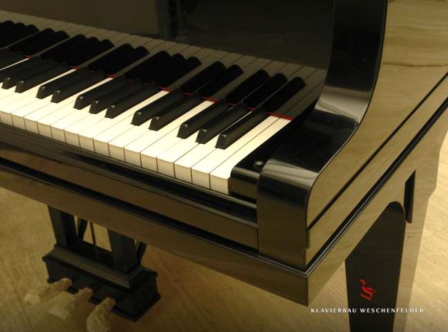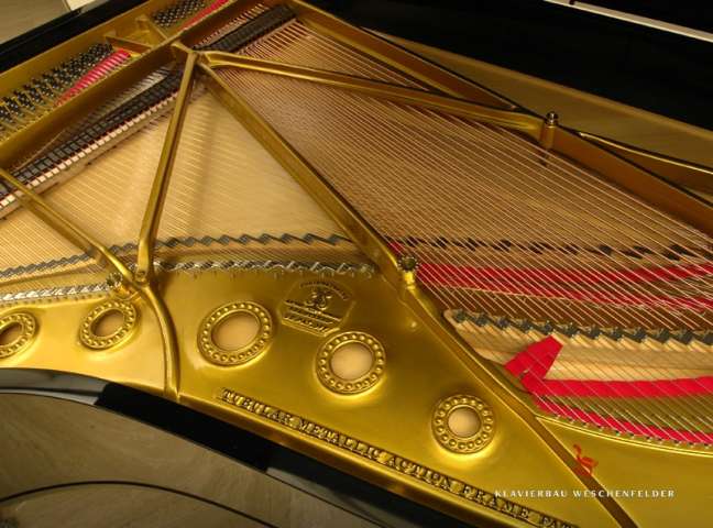 Bei der Überholung der akustischen Anlage wurde besonderer Wert darauf gelegt einen Hochglanzlack für die Versiegelung des Bodens einzusetzen. Die gebläuten Wirbel entsprechen der damaligen Neuauslieferung.